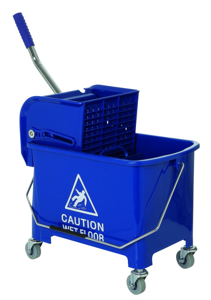 Mini chariot compact, cuve 20 litres avec séparateur eau propre/eau sale. Presse à plat amovible avec poignée démontable. 4 roulettes pivotantes.